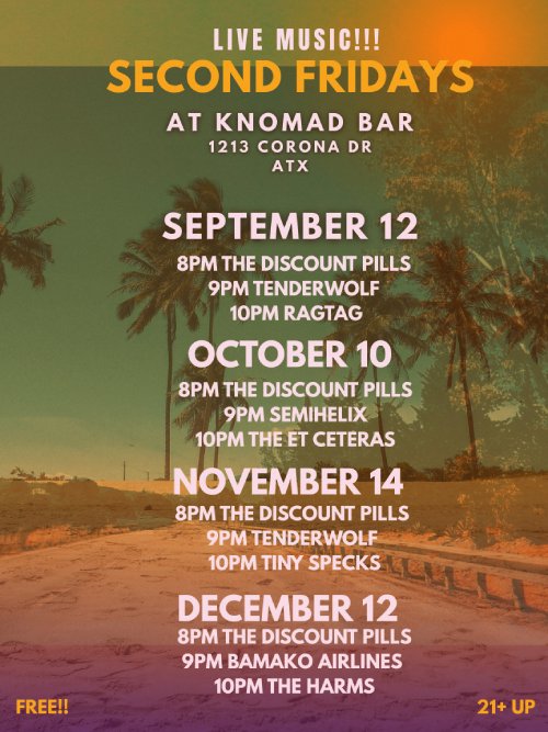 8pm - The Discount Pills 9pm - Bamako Airlines 10pm - The Harms