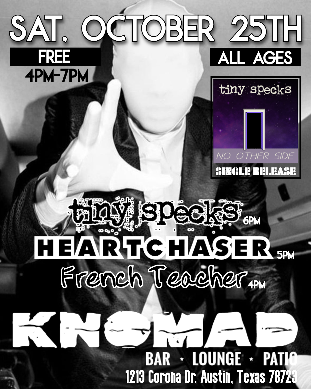 4pm - French Teacher 5pm - Heartchaser 6pm - Tiny Specks (single release)